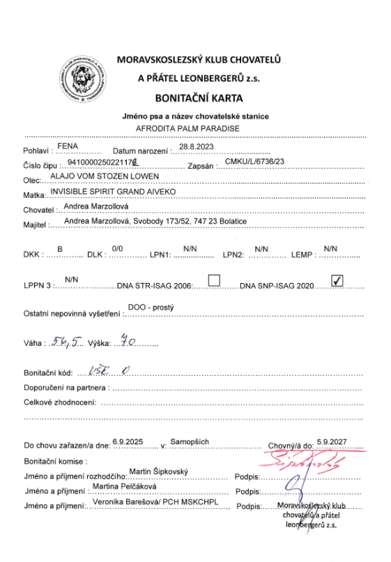6. 9. 2025 splnila Afrodita Palm Paradise poslední podmínku k uchovnění a tou byla úspěšná bonitace. Tou Leontýna prošla na výbornou, stejně jako před léty její matka. Všechny hodnocené body měla se známkou nula, výška 70 cm, váha 56,5 kg.